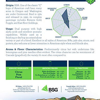 Features: Alpha acid: 8.0-11.0 percent Origin: united states All BSG Hops are packaged in nitrogen-flushed, oxygen and light-barrier packages Details: Origin: USA. Also known as VGXP01 and is exclusively managed...